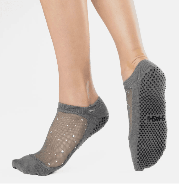 Sophisticated Sparkle for Every Studio Session Elevate your practice with the Shashi Sparkle Mesh Full Foot grip socks. A perfect blend of fashion and function, these socks feature a breathable sheer mesh top infused with a high-intensity metallic sparkle.