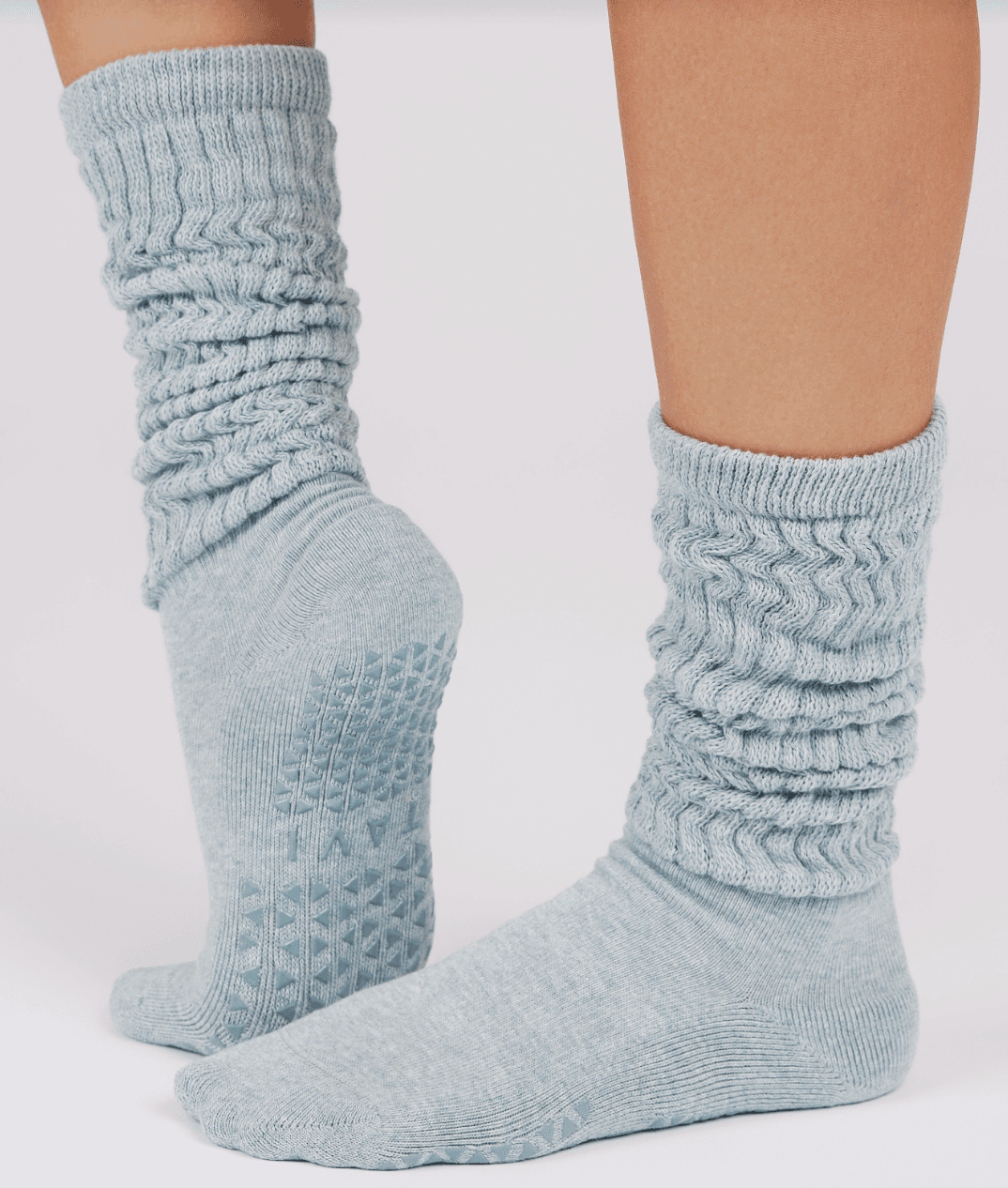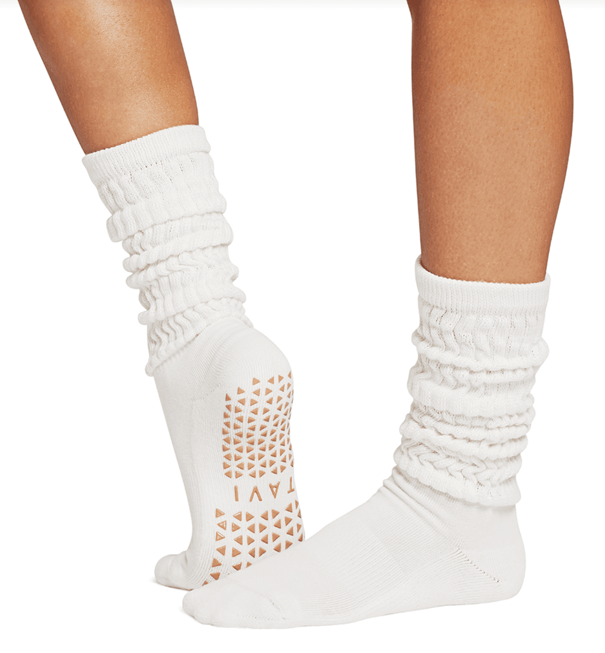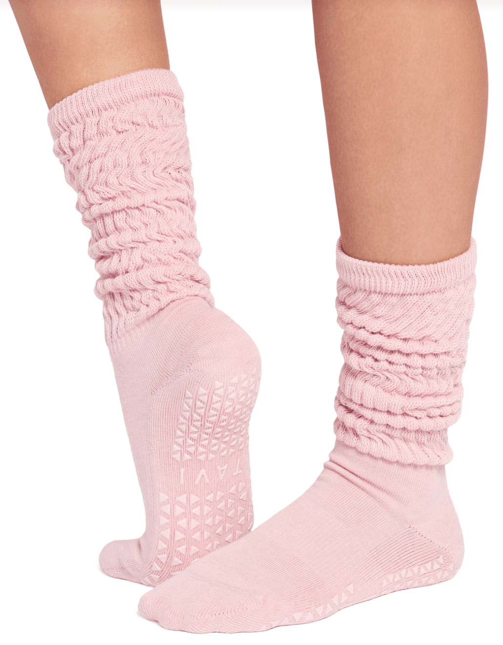Get the perfect scrunch. The Tavi Noir Stacy is a sparkling slouch sock designed for the studio. Combining a relaxed, cozy fit with a signature non-slip grip and arch support, these socks offer an effortless look for your next Pilates, Barre, or Yoga session.